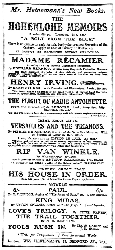 ![]() Heinemann, London, 1906 Criticism When it was first published Personal Reminiscences of Henry Irving was criticized by some critics for containing too much information on Stoker. According to the New York Times Saturday Review of Books in the October 20, 1906 issue of The New York Times, New York, "Almost every one criticises it here because, though it is called a book about Irving, it is really a book about Stoker and Irving. There is something naively appealing in the way Mr. Stoker seems to suppose the public will be equally interested in himself and the great actor." Rather ironically, most modern readers are interested in Personal Reminiscences of Henry Irving for this very reason. Short story publication Three very short stories from this book have been expanded, given given new titles and republished as a collection under the name "Midnight Tales". In 1990 they appeared in the short story collection Midnight Tales, Peter Owen Publishers, London. Availability This book is available as a: The review is available as a: It can also be purchased online as a: Early publication notice