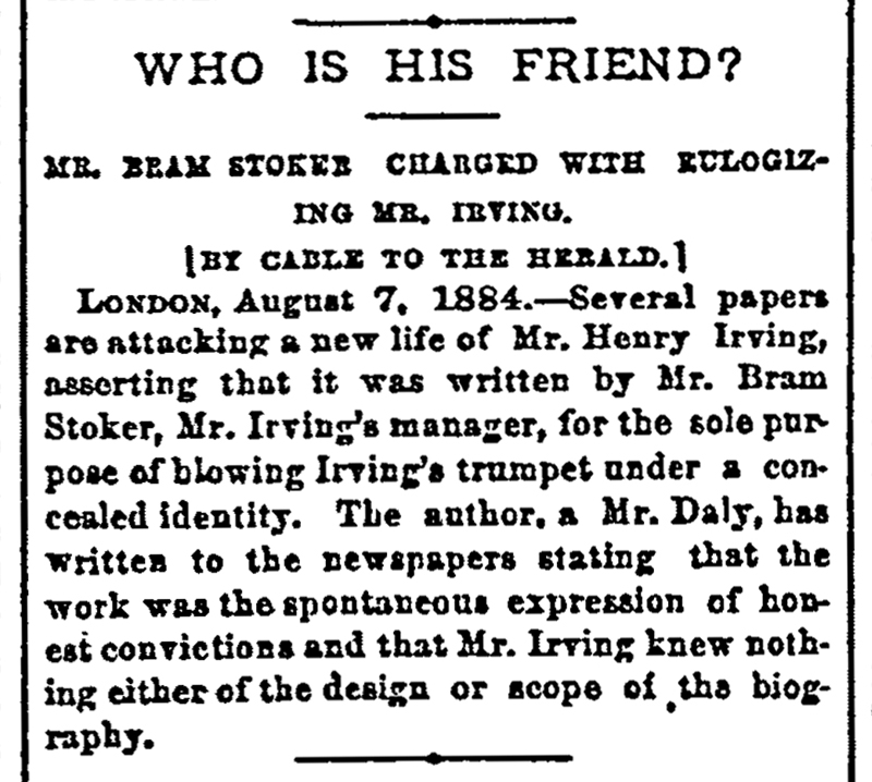 The publication page of Henry Irving in England and America 1838-84 states that it was written by Frederic Daly. However, shortly after it was published, the authorship of this book was called into question. The press in the UK claimed that it was written by Bram Stoker who was at that time working as Irving's personal secretary. In response, Mr. Daly wrote to several newspapers in the UK and US and denied that he was Stoker. It was later discovered that Frederic Daly was a pseudonym used by Henry Irving himself. At this time, it is unknown whether Stoker had a hand in writing this book or not.