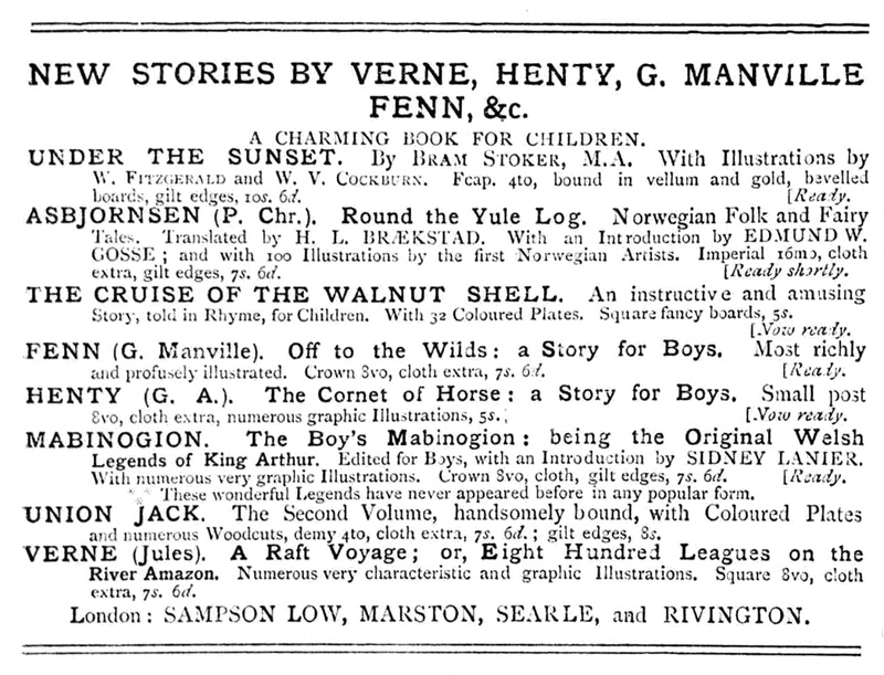 Under the Sunsetwas Bram Stoker's first collection of short stories. It is a collection of eight stories for children with 33 illustrations by W. Fitzgerald and W. V. Cockburn. It was first published in the UK in November 1881 by Sampson Low, Marston, Searle and Rivington, London. The book itself is a 190 page hardcover with a cream colored imitation vellum cover stamped on the spine and front panel in red and gold. In October 1882 the publishers released a 191 page second edition with 48 illustrations by the same artists. The cover of the first printing of this edition was identical to the first edition while subsequent printings had a dark green cloth cover stamped on the spine and front panel in gold. Under the Sunset was first published in the US in October 1978 by Newcastle Publishing Company, North Hollywood, California as a part of their Newcastle Forgotten Fantasy Library (Vol. 17). This edition is a 180 page trade paperback with a picture of a skull shaped doorway on the front cover. It is a reproduction of the first edition and has the original 33 illustrations.Sampson Low, Marston, Searle and Rivington (publisher) First edition book cover